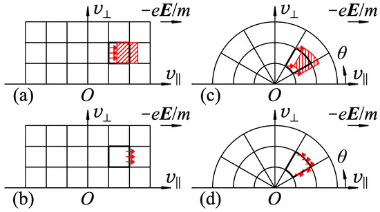 Cells defined in two-variable velocity space or , and treatment of the intercellular electron transition by acceleration: (a) Lagrangian treatment in Cartesian-v cell configuration; (b) Eulerian treatment in Cartesian-v cell configuration; (c) Lagrangian treatment in polar-v cell configuration; and (d) Eulerian treatment in polar-v cell configuration. The thick boundaries indicate the source cells from which electrons flow out downstream (rightward) by acceleration. The red hatched cells are the Lagrangian cells.