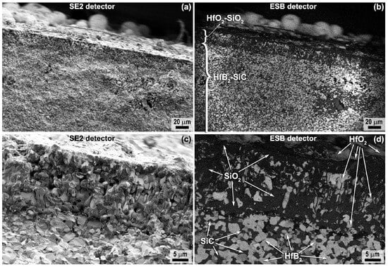 - Simonenko, E.P.; Simonenko, N.P.; Kolesnikov, A.F.; Chaplygin, A.V.; Lysenkov, A.S.; Nagornov, I.A.; Simonenko, T.L.; Gubin, S.P.; Sevastyanov, V.G.; Kuznetsov, N.T. Oxidation of graphene-modified HfB2-SiC ceramics by supersonic dissociated air flow. J. Eur. Ceram. Soc. 2022, 42, 30–42. [Google Scholar] [CrossRef]