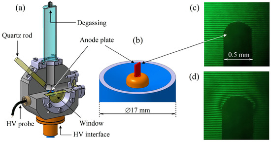 Simplified sketch of (a) the reactor chamber composed of a grounded stainless-steel body, windows for optical diagnostics, and a water inlet/outlet, and (b) the coax-based HV electrode (plate anode). Images (c,d) show examples of interferograms near the plate anode (visible as the dark silhouette) captured at zero voltage (c) and at 160 kV (d).