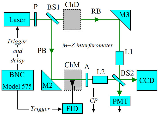 Block scheme of the interferometric (Mach–Zehnder) setup: P—polarizer; A—analyzer; M1 and M2—mirrors; RB—reference beam; PB—probing beam; ChD—delay chamber; ChM—measurements chamber with the plate anode; BS1 and BS2—beam splitters; PMT—photomultiplier; L1 and L2—objective lenses; FID—high-voltage pulsed source; CP—signal from the capacitive probe.