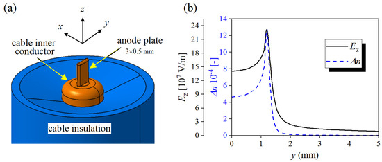 Orientation of axes with respect to the plate anode (a) and z–component of electric field in the y–z plane calculated at a voltage of 150 kV and corresponding ∆n determined by Equation (1) (b). The position of the electrode apex corresponds to z = 0, and vertical axes of symmetry correspond to x = 0 and y = 0.