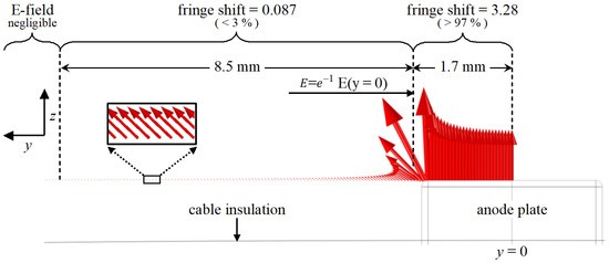 This enables us to estimate the phase shift produced by two main areas: just above and near the plate electrode. This is depicted in Figure 5, where the distribution of the electric field lines is also shown with red arrows. As the phase shift depends on E2, the value of the integral in Equation (2) is mainly determined by the field above the electrode and in its close vicinity.