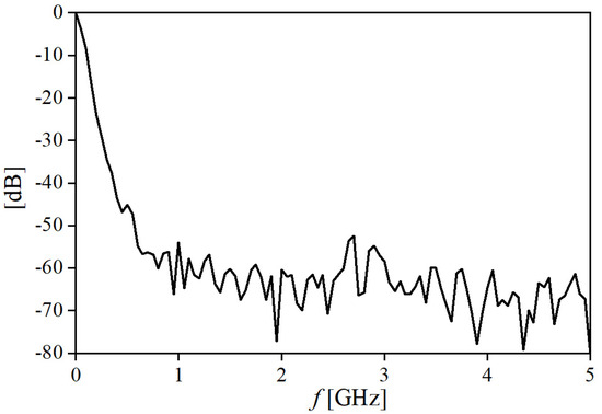 where E(0) is the static electric field, E(ω) is the electric field of the probing laser radiation, χ(3) is the third-order part of the nonlinear susceptibility tensor, ε0 represents the vacuum permittivity, and the factor of 3 is a result of intrinsic symmetries of the tensor in an isotropic medium [22,23]. Although the analyzed electric field is rapidly changing, the bandwidth of its driving voltage pulse falls to the noise level at ~500 MHz (Figure 6). The bandwidth is 6 orders lower than the laser frequency (5.64 × 1014 Hz) and is safely outside the water dielectric dispersion area and the loss spectrum [24].