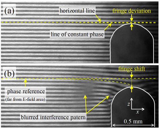 The captured interferograms evidence fringe deviation caused by imperfections in the adjustment of the objective lenses and brightness gradient (Figure 7a). These deviations are reproducible in all interferograms captured with the same setup and are, therefore, easily corrected. Figure 7b shows the fringe shift when a strong electric field surrounds the electrode. The fringe shift is evaluated at the apex of the electrode by comparing the fringe position there with its counterpart far from the electrode, where the electric field is negligible. There is a clearly blurred interference pattern aside from the electrode, whose explanation is out of the scope of this study. However, it seems that it has something to do with the rotation of the laser beam polarization [25], which occurs when the beam polarization is neither parallel nor perpendicular to the static electric field. Therefore, in this experiment, the interferometer is set up such that the fringes in the presence of electric field always shift toward the electrode. This ensures that the examined fringe near the electrode apex does not lead across the empty area, and therefore, it can always be paired up with a fringe to the far left of the electrode. Furthermore, due to the electrode symmetry, the electric field at the apex always aims just in the z-direction. Polarizing the laser in the z- or x-direction means that the polarization direction is always either parallel or perpendicular to the electric field in the axis of symmetry, i.e., at the electrode apex.