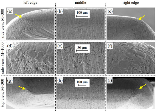Morphology of the electrode tip in the central area and edges. Macroscopic views (a–c,g–i) and detail (d–f). Yellow arrows in (a,c,g,i) point to the path on which the discharge was evidently preferentially formed.