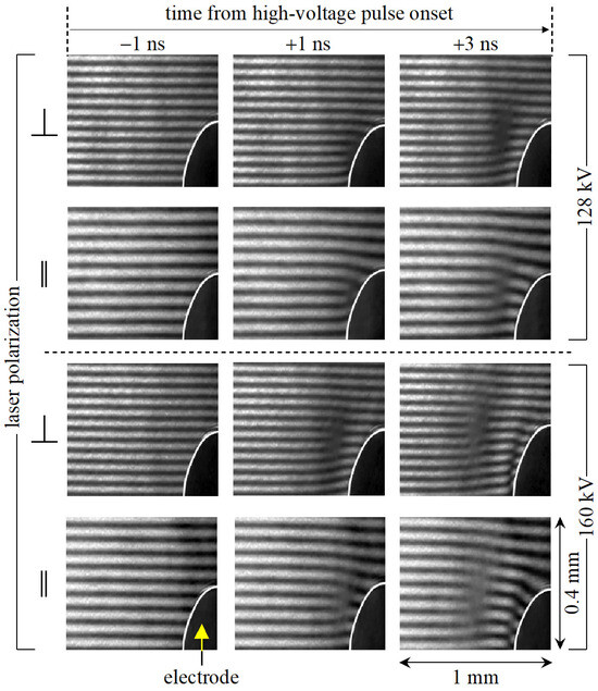 Figure 10 shows a short series of selected interferograms illustrating the degree of fringe shift at two voltage amplitudes (128 and 160 kV), and both perpendicular (horizontal) and parallel (vertical) laser polarizations with respect to the electric field at the electrode apex (vertical only). For reasons mentioned in Section 2.3, the interferometer is set up in such a way that the fringes always shift downwards, which would otherwise not be the case. The fringe width is adjusted to be much smaller than the electrode apex radius, which enables precise “sampling” of the area.