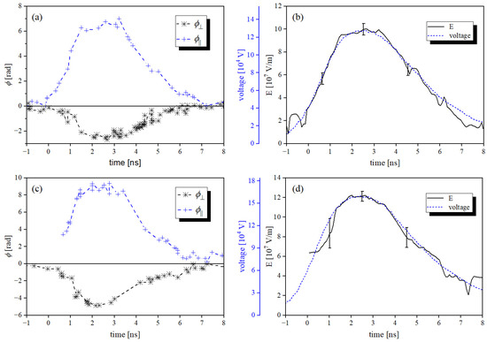 Time dependence of phase shift in both laser polarizations (a,c) and corresponding reconstructed electric field waveforms together with the voltage waveforms gained from the HV probe (b,d). The voltage amplitude was 128 kV (a,b) and 160 kV (c,d).
