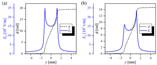 where y1 and y2 delimit the area along the integration path and Ez considerably contributes to the phase shift. In this case, Equation (13) gives E = 157 MV/m, which is also much larger than the measured value (<125 MV/m). There can be several reasons for this discrepancy. First, the real value of the Kerr constant is different from that used in data processing. Second, any imperfections in the electrode shape (hand-made electrode) might lead to a weaker electric field in the experiment. Third, the laser beam might be slightly misaligned. Figure 12b shows Ez along a path, which is elevated at one side of the electrode in the z-direction by 0.25 mm. This type of misalignment might be possible. In this work, we were unable to check the electrode position in the experimental chamber with better precision. The calculated phase shift and electric field are then much closer to the measured values, 14.7 rad and 136 MV/m.