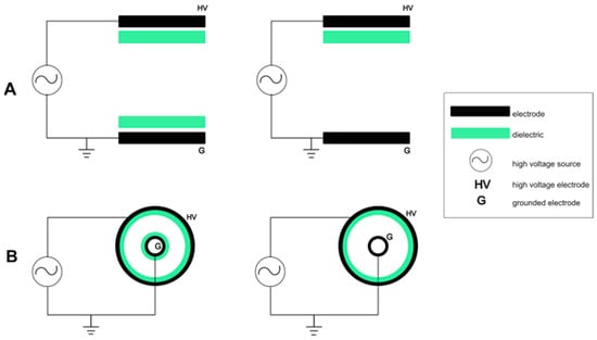 DBD configurations comparison. (A) Planar configuration, (B) cylindrical configuration.
