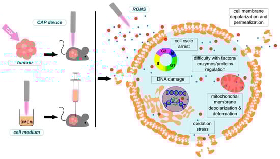 Cold plasmas have proved to be a worthy candidate for innovative cancer treatment methods [12]. Therefore, a proper understanding of the interaction between CAP and cells or tissues is necessary. Knowledge of chemicals that are created during plasma treatment and their impact on living organisms has become obligatory. Formed thus, these compounds may induce various effects depending on their concentration or the environment they are exposed to [13]. For instance, reactive oxygen species (ROS) may cause a ‘plasma killing effect’, meaning they are lethal for cells, creating cytotoxicity [14]. In contrast, other types of free radicals, such as reactive nitrogen species (RNS), may induce a more positive or even desired ‘healing plasma effect’ [15].