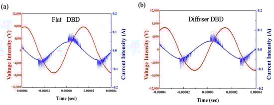 Voltage and current waveforms of the flat DBD and diffuser DBD at (a) 140 W and (b) 80 W total power consumption. Power consumption was calculated from the Vrms and Arms values.