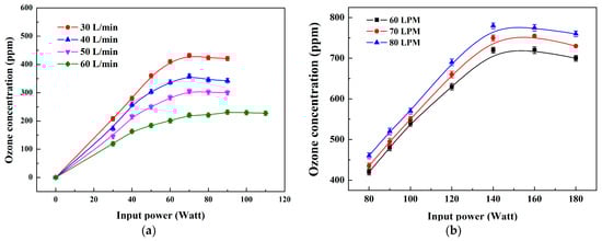 Graphs showing the ozone concentrations for the optimal experimental conditions of the (a) diffuser-type DBD and (b) flat DBD plasma modules. Each measurement was performed in triplicate for a given condition.