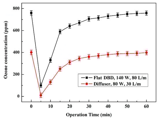 Dye degradation may require a large amount of active species during the degradation process. In this sense, the ozone concentrations were measured according to the operating time as the ozone passed through the dye in water, and these were measured at the reactor outlet. Figure 4 shows the comparison of the time-dependent changes in the ozone concentration in degrading dyes in water. The two DBD plasma modules were operated under the optimized conditions, as shown in Figure 3. The ozone gases from the plasma modules were bubbled into the liquid through a microporous bubbler inside the reactor. The initial ozone concentrations of the flat DBD and diffuser DBD plasma modules were 750 ppm and 400 ppm, respectively. As shown in Figure 4, more than 90% of the initial ozone concentration was consumed in both plasma modules, resulting in rapid degradation of the dyes in the water. After 5 min of operation, the ozone concentrations of the two plasma modules were quickly returning to the initial concentrations. The results of this experiment are consistent with the results shown in Figure 5. In this context, we observed the changes in the dye concentration over the operation time using a UV/visible spectrometer.