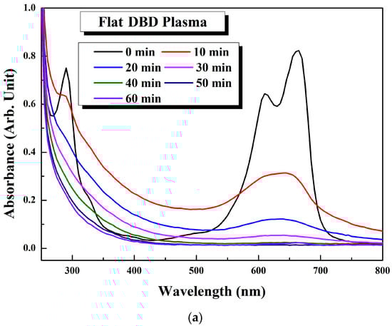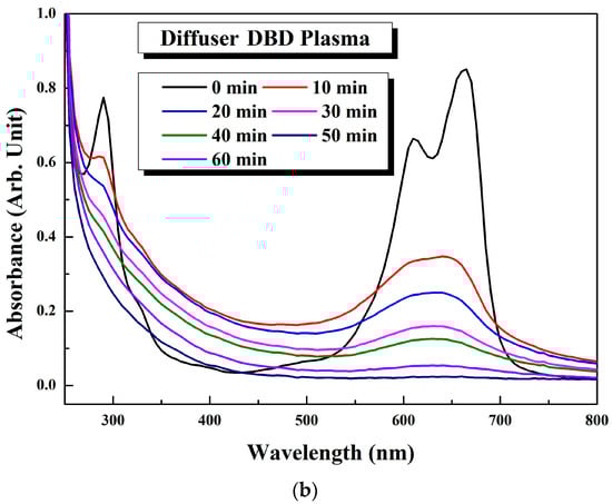 UV-visible absorbance spectra of the methylene blue solutions based on the plasma treatment time. (a) UV-visible absorbance spectra of the flat DBD plasma (air flow rate = 80 L/min, input power = 140 W); and (b) UV-visible absorbance spectra of the diffuser DBD plasma (air flow rate = 30 L/min, input power = 80 W). The initial concentration was approximately 143 ppm.