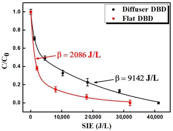 Figure 6 shows the experimental decomposition results. The analysis was conducted for 60 min at an initial MB concentration of approximately 143 mg/L, corresponding to the experimental results in Figure 5. The efficiency was low for the first 10 min but gradually increased, and complete decomposition was achieved at 40 min for the flat DBD plasma and 50 min for the diffuser DBD plasma. This was estimated using a model in water with NTP through simple primary fragmentation, The formula for the simple first-order decay model [36] is , where represents the dye concentration remaining after the DBD treatment; represents the initial concentration; E represents the specific input energy (SIE) density during treatment; and β represents the energy density required to reduce the initial concentration to 63%. The β values of the flat DBD and the diffuser DBD plasma were 2086 J/L and 9142 J/L, respectively, explaining that the flat DBD plasma with a higher ozone concentration at a lower input energy degraded faster than the diffuser DBD plasma. Thus, the effectiveness of the flat DBD plasma treatment for MB removal was demonstrated.