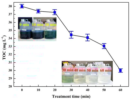 The mineralization of MB is the complete degradation of MB molecules into CO2 and H2O, with the total organic carbon (TOC) as an index of the degree of mineralization. In this context, Figure 7 shows the TOC analysis of the MB solution according to the treatment time. The insets are images of the MB solution with different treatment times. The TOC removal was approximately 20% after 60 min of plasma treatment. This result is higher than that obtained by Reddy et al. [39] under similar conditions. Meanwhile, the chemical oxygen demand (COD) removal reached 31% after 60 min of plasma treatment. In comparison, the TOC removal after 30 min of ozone treatment was 14.2% [39]. This may indicate that the plasma reactor in this work can be promising for the mineralization of pollutants.