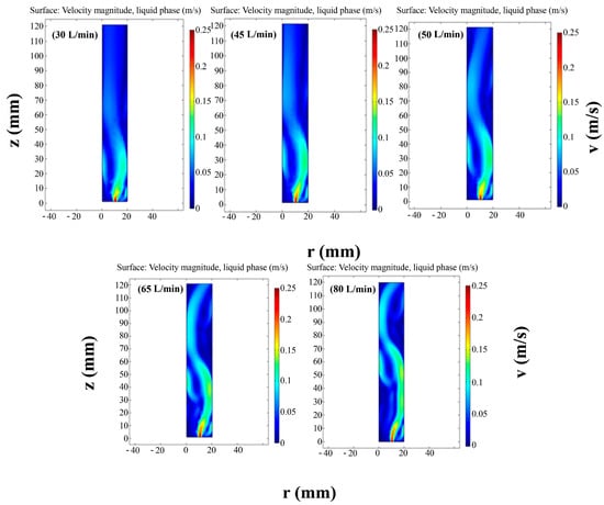 A two-phase flow was used to simulate the flow phenomenon that occurred by controlling the flow rate of the bubbles generated through a bubbler in the reactor by using the COMSOL Multiphysics program (v5.3a, Stockholm, Sweden). For the flow simulations, the governing equations are as follows. The bubbly flow interface sets up a two-stage flow model for liquid and oxygen bubbles. The physics interface covers the liquid velocity, pressure, and gas phase volume fraction. For laminar flow, the gas velocity is calculated as follows: , where represents the liquid phase velocity, and represents the relative velocity between gas and liquid, that is, the slip velocity. The slip speed is calculated from the slip model. We used the Hadamard–Rybczynski model, a pressure drag-balanced slip model with an adjusted drag coefficient for small spherical bubbles. The bubble diameter is considered to be 100 μm. The laminar bubbly flow interface for this model was used to simulate the flow of liquids with dispersed bubbles. At low and moderate Reynolds numbers, the bubbles were assumed to occupy only a small volume fraction and to always move at their final velocities. Therefore, only one set of Navier–Stokes equations could be solved. For the liquid phase, we allowed the velocity of the bubbles to be guided by a slip model. Subsequently, the pressure distribution was calculated. From the average continuity equation of the mixture, the volume fraction of the bubbles was tracked by solving the effective gas density transport equation. The physical interface also determined the distribution of the number density. The interfacial area can be calculated using the number of bubbles per unit volume, which is useful for simulating chemical reactions in mixtures. The mesh was supported by software and consisted of a physics-controlled mesh. As shown in Figure 8, the flow rates were set to 30, 45, 50, 65, and 80 L/min. When the bubble flow rate was low, the wall-peaking phenomenon, in which the bubble rate was concentrated on the wall, and the core-peaking phenomenon, in which the bubble rate was high, were observed. Because air was injected into the bottom regardless of the flow rate, the air column caused was by the flow rose while shaking to the left and right. By selecting the optimal conditions through simulation and applying them to the reactor, many bubbles were able to contact the liquid surface and quickly degrade the dye agent [40]. This simulation result is consistent with the experimental results in Figure 5 and Figure 6, which show that the flat DBD plasma with a higher ozone concentration at a higher flow rate (80 L/min) can produce more bubbles than the diffuser DBD plasma with a lower ozone concentration at a lower flow rate (30 L/min). As shown in Figure 8, as the gas flow rate increases, the bubbles occupy the inside of the reactor and create a vortex flow with rapid bubble rise. This can increase the opportunities for contact with impurities, which can rapidly degrade the MB dye.