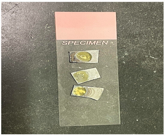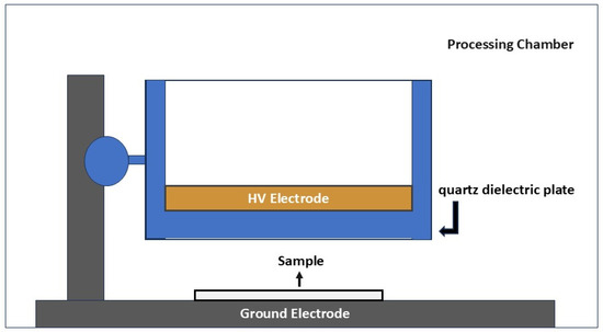 The DBD plasma was generated using a microsecond-pulsed power supply (FID Technology, Burbach, Germany) and an electrode–dielectric barrier discharge setup, as described previously [7]. In summary, the DBD electrode operates by producing a plasma stream between a high-voltage copper plate (25 mm thick) and a grounded electrode (Figure 1). A 1 mm thick quartz dielectric plate serves as an insulating barrier over the copper plate. The plasma discharge gap between the bottom of the quartz plate and the sample surface was 5 mm. Plasma was generated using a variable voltage and frequency power supply, which applied a pulsed alternating polarity voltage of 20 kV (peak-to-peak) with a 10 ns pulse width and a rise time of 5 V/ns. For all experiments, a peak voltage of 11.2 kV and a repetition frequency of 690 Hz were used. The input energy was calculated to be approximately 10 mJ per pulse. The plasma treatment area corresponded to the dimensions of the copper plate, measuring 38 mm × 64 mm.