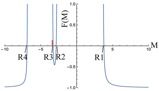 The variation in with M is shown in Figure 1 for the normalized parameters of the plasma sheet region, as reported by Kamaletdinov et al. [56]: , , , , , and . We obtain four real roots, R1, R2, R3, and R4, as shown in Figure 1, which represent the critical Mach numbers. The roots R1 () and R4 () correspond to the fast ion-acoustic (FIA1) and (FIA2) modes propagating parallel and anti-parallel to , respectively. Further, roots R2 () and R3 () correspond to the slow ion-acoustic modes (SIA1) and (SIA2) propagating anti-parallel to . It is seen that both roots R2 and R3 occur close to the minimum of the proton VDF, shown as a short vertical red line.