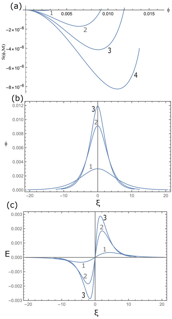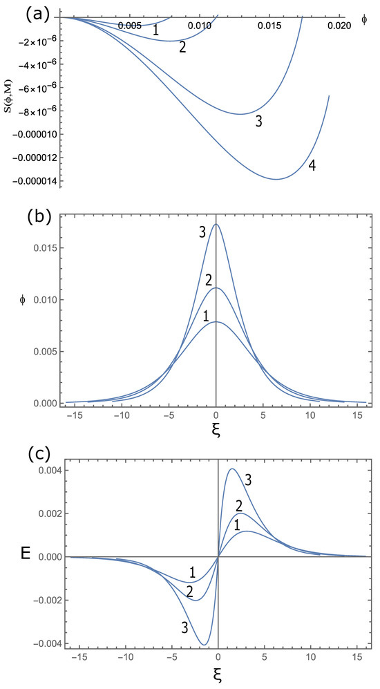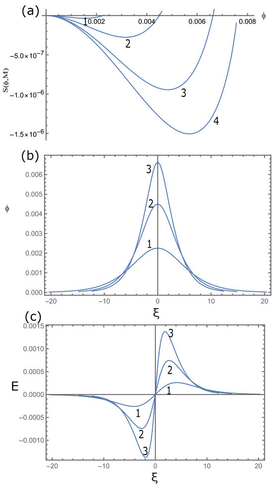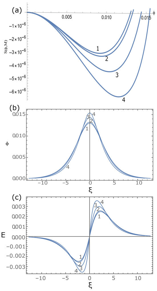 Figure 3 shows the properties of slow ion-acoustic (SIA2) solitons which propagate anti-parallel to for and other plasma parameters of Figure 1. The slow ion-acoustic solitons, SIA2, have positive potentials, and the maximum electrostatic potential increases with a decrease in the Mach number, M (see curves 1, 2, and 3). In this case, there is a minimum value for M, say, , below which soliton solutions do not exist (refer to curve 4). The existence of a new class of slow ion-acoustic solitons below the critical Mach number, , has been pointed out by researchers [66,69]. The corresponding electrostatic potential and electric field profiles are shown in panels (b) and (c) of Figure 3, respectively (refer to curves 1, 2, and 3).