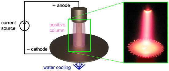 Atmospheric Pressure Glow Discharge (APGD) with a planar cathode configuration. Illustration of the APGD setup controlled by the total electric current from a current source and the intensity of forced convection cooling of the planar cathode, together with an optical image from Arkhipenko et al. [4] (reproduced with permission, © IOP Publishing 2009).