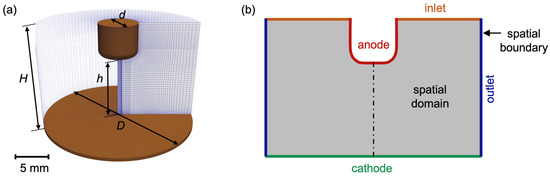 Computational domain. (a) Schematic representation of the three-dimensional computational domain with interelectrode gap h = 10 mm, domain height H = 15 mm, cathode diameter D = 24 mm, and anode diameter d = 6 mm. (b) Boundary sides across a radial slice of the spatial domain.