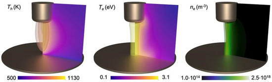 Representative results of the helium APGD operating with a total discharge current Itot = 20 mA and strong convective cooling of the cathode (hc = 1000 W·m−2·K−1) are shown in Figure 3. The results in Figure 3 depict the structure of the positive column in terms of the heavy-species temperature Th, electron temperature Te, and electron number density ne. The distribution of Th presents a globular shape with a maximum temperature of over a thousand Kelvin in the center of the discharge. The distribution of Te shows a different structure from that of Th; its shape is closer to a column, presenting a maximum of slightly over 3 eV, a value representative of APGDs. The distribution of ne shows an hourglass shape, somewhat resembling the distribution of Te, but depicting significant constriction near the center of the positive column.