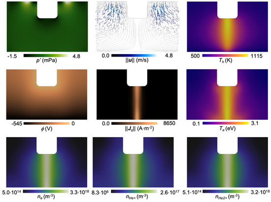 Representative discharge characteristics. Contour plots of gauge pressure p′, magnitude of velocity ||u||, temperatures Th and Te, electric potential ϕ, magnitude of current density ||Jq||, and number density of electrons nHe, helium ion nHe+, and helium dimer ion nHe2+. Conditions: Itot = 20 mA and hc = 1000 W·m−2·K−1.