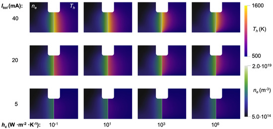 The results in Figure 7b depict the discharge structure near the cathode for Itot = 20 mA and two levels of cathode cooling, namely free convection cooling and strong forced convection (i.e., hc = 10 and 1000 W·m−2·K−1, respectively). These results show the drastic change in the structure of the distribution of Th with increasing cathode cooling level, whereas the distribution of ne remains nearly unchanged. As described next, this has important implications for the formation of patterns over the cathode.