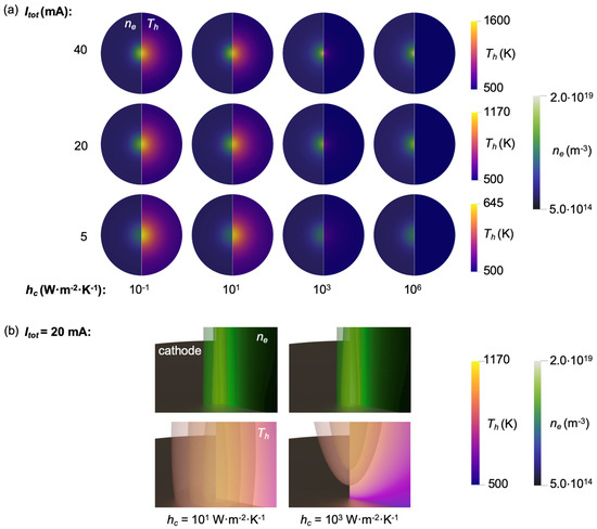Near cathode characteristics. (a) Contour plot of electron number density ne (left-half of each plot) and of heavy-species temperature Th (right-half) over the surface of the cathode as a function of total current Itot and convective heat transfer coefficient over the cathode hc. (b) Three-dimensional view of the distribution of ne and Th near the cathode for Itot = 20 mA and two levels of cathode cooling, hc = 10 and 1000 W·m−2·K−1.