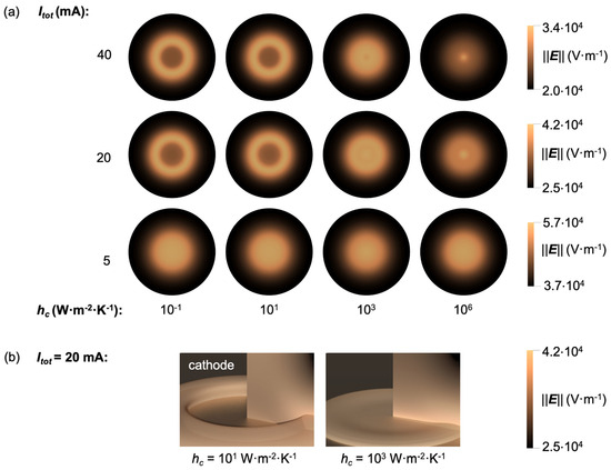 Figure 8 presents contour plots of the magnitude of the electric field E = ||E|| as a function of total current Itot and cathode convective heat transfer coefficient hc. The distribution of the magnitude of the electric field in Figure 8a displays a clear ring-like pattern along the surface of the cathode for the higher current (Itot 20 mA) and lower cooling cases (hc 10 W·m−2·K−1). This behavior was not observed in the APGD simulations reported in [13], which did not consider the full geometry or diffusion due to the ambipolar electric field. The patterns appeared spontaneously with a marked dependency on the level of cathode cooling and the magnitude of total current. The 5-mA discharges do not display pattern formation independently of the cooling of the cathode. The 20 and 40 mA cases display pattern formation for the four cases with < 102 W·m−2·K−1. The structure of a ring pattern is more clearly depicted in the results in Figure 8b for Itot = 20 mA and for free convection cooling and strong forced convection (i.e., hc = 10 and 1000 W·m−2·K−1, respectively), corresponding to the distributions of ne and Th shown in Figure 7b. The ring pattern is localized to the near-cathode region, depicting a toroidal shape centered at the axis of the discharge. This localized structure of the electric field is in contrast to the columnar structure of the electron number density observed in Figure 7b.