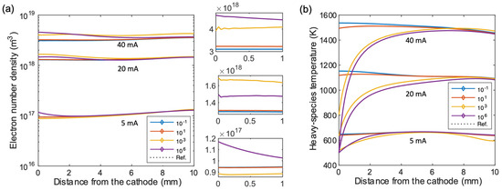 To assess the influence of cathode cooling on the overall discharge more clearly, Figure 9 presents the distribution of electron number density ne and heavy-species temperature Te along the axis of the domain. The results in Figure 9a show the distribution of ne for the different values of current Itot and levels of cathode cooling hc. The three plots on the right side of Figure 9a are magnified views of the distribution of ne over the first millimeter of the discharge. In our previous study [13], we noted that the discharge had a regime change between the low-current and the high-current cases, with a threshold of approximately 15 mA. The electron number density for the lowest current cases showed a monotonically increasing trend with the distance from the cathode. In contrast, the higher current cases displayed a local minimum in the center of the discharge and a higher number density at the anode and cathode. In this study, the trend is slightly different. Specifically, for the low-current cases of Itot = 5 mA, the results show a local minimum for high cathode cooling. Nevertheless, this minimum is not in the center of the discharge, and the global trend of the discharge is still monotonically increasing with the distance from the cathode. The electron number density distribution for Itot = 20 and 40 mA presents a local minimum similar to that reported in [13]. The slight difference in this trend may be explained by the change in boundary condition at the anode. In [13], the temperature profile was imposed along the anode, while in this study, the heat flux is modeled using a convective cooling model, as shown in Table 4. We associated the trend change in plasma properties as being a marker of competing phenomena during the progressive thermalization of the discharge.