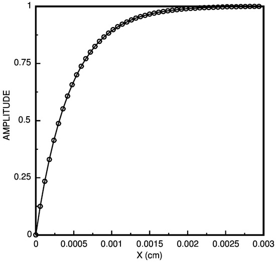 Steady state solution for electrons moving from right to left into an anode compared with the exact solution. c = 0.8, s = 6, w = cm/s and number of time-steps = 3334. The solid curve is the exact solution given by Equation (12); the circles represent the flux-corrected solution.