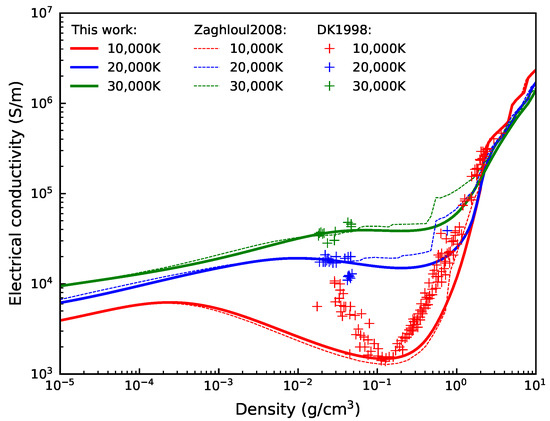 To validate the electrical conductivity model employed in this study, the isotherms of for Cu plasma at T = 10,000, 20,000, and 30,000 K are calculated, as shown in Figure 2. Good agreement with the results of Zaghloul [12] confirms the overall accuracy of the model. Discrepancies primarily occur within 0.1 < < 2 g/cm3, and are more pronounced at elevated temperatures of 20,000 K and 30,000 K. At these moderate densities, the predominant contribution to the total electrical conductivity arises from the electron–neutral collision term , which is inversely proportional to according to Equation (15). As discussed in Section 3.1, the abrupt decrease in due to the inclusion of electronic excitation states leads to an increase in as well as . However, the discrepancies in remain in a relatively narrow density range, and the overall applicability of the model is not affected.