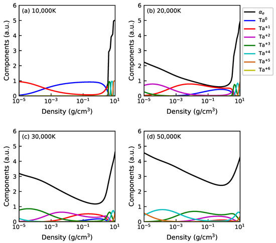 After validating our theoretical model and numerical algorithm, we proceed to calculate the detailed composition of tantalum plasma as a function of density at various temperatures, specifically T = 10,000 K, 20,000 K, 30,000 K, and 50,000 K, as illustrated in Figure 3. Ionization states up to are included in our calculations. Similar to the case of Cu, the abundance of the ith state (i > 6) is negligible, and only the first six ionization states are plotted for clarity. Several characteristics of the detailed composition of Ta plasma are observed. Firstly, the average ionization states s exhibit a minimum value in the vicinity of ∼1 g/cm3. At low densities, such as = 10−5 g/cm3, shows a roughly linear dependence on temperature T, increasing from 1 at 10,000 K to approximately 4.5 at 50,000 K. In contrast, at high densities near 10 g/cm3, remains around 5 and is insensitive to temperature increase. This feature can be attributed to variations in ionization compositions. At high densities, higher ionization states dominate due to the reduction in ionization energies, even at lower temperatures. In particular, the Ta+3 to Ta+5 species constitute the majority of the ionization composition at T = 10,000∼50,000 K. Consequently, the average ionization state remains relatively stable with respect to temperature changes. On the other hand, the ionization composition at low densities undergoes significant changes as T increases. Specifically, the Ta+1 species dominates at 10,000 K, followed by the Ta+2 species at 20,000 K, and so forth. This successive increase in the charge state of the dominant species results in a linear temperature dependence of .