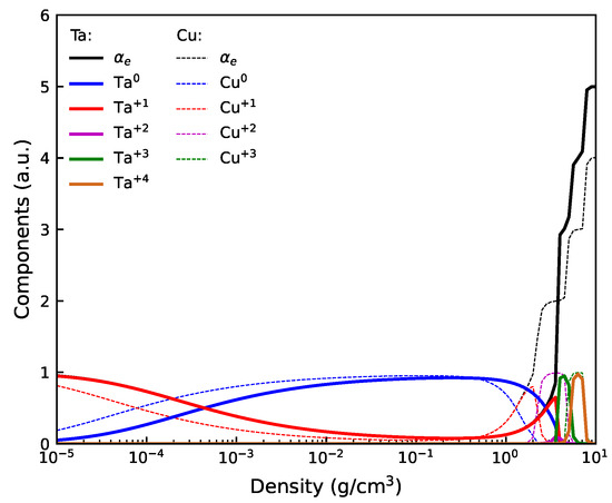 Secondly, it is intriguing to compare the average ionization states and detailed ionization compositions of tantalum and copper plasmas at identical densities and temperatures to evaluate the effects of elemental species, as shown in Figure 4. It is noteworthy that the different ionization states of the two elements exhibit remarkably similar compositional behaviors. In particular, the Ta+1 and Cu+1, Ta+3 and Cu+2, and Ta+4 and Cu+3 species demonstrate qualitatively similar density-dependent relationships. These similarities among the various ionization states of different elements can be attributed to the comparable ionization energies of the corresponding states. The ionization energies of Cu0, Cu+1, and Cu+2 are 7.73 eV, 20.29 eV, and 36.84 eV, respectively. Similarly, the ionization energies of Ta0, Ta+2, and Ta+3 are 7.55 eV, 23.1 eV, and 35.0 eV, respectively. The ionization energies of these two elements are closely aligned, resulting in the similar ionization compositions observed.