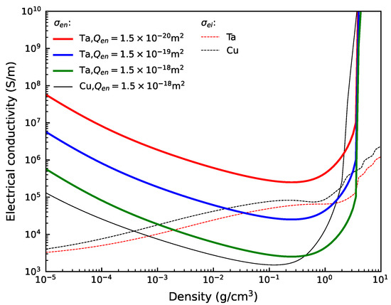 where is the average electron–neutral momentum transfer cross-section [20,21]. In the following calculations, ≈ 1.5 × 10−18 m2 for copper is adopted [12] (see Section 3.1), while for tantalum is set to 1.5 × 10−18, 1.5 × 10−19, and 1.5 × 10−20 m2 in order to discuss its effects on electrical conductivity calculations (see Section 3.4).