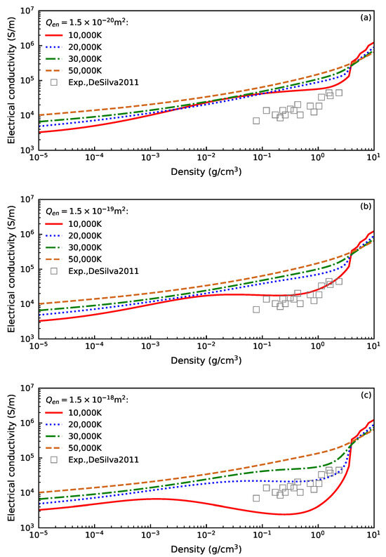 Isotherms of the calculated electrical conductivity of Ta as a function of density and temperature, with varying average electron–neutral momentum transfer cross-sections: (a) = 1.5 × 10−20 m2, (b) = 1.5 × 10−19 m2, and (c) = 1.5 × 10−18 m2. For reference, the experimental measurements by DeSilva and Vunni [8] (gray open squares) are also included. Notice that the conductivity was measured as a function of relative internal energy rather than temperature, and the estimated temperatures were approximately between 20,000 K and 30,000 K [8,9].