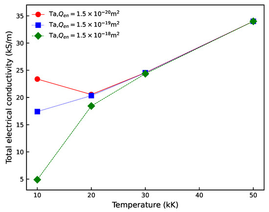 It has also been observed that for densities around 10 mg/cm3 and sufficiently small values of , the temperature dependence of electrical conductivity can exhibit non-monotonic behavior. As illustrated in Figure 7, for = 1.5 × 10−20 m2, the electrical conductivity decreases as the temperature rises from 10,000 K to 20,000 K, and then increases with further temperature increases. In contrast, for larger values of , electrical conductivity increases monotonically with temperature T.