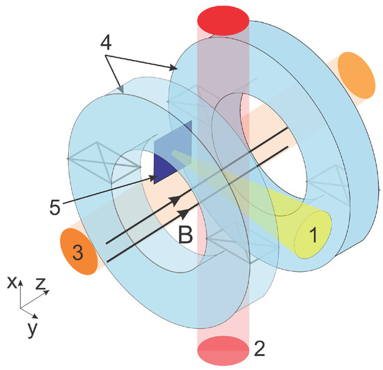 In the experiments aimed at studying the influence of an external magnetic field on the evolution of plasma flows, the target was placed in a quasi-uniform magnetic field with a strength of approximately 14 T, generated by a pulsed magnetic system (see Figure 1). The target surface was positioned along the magnetic field lines. The magnetic system consisted of a pair of Helmholtz coils. Details about the magnetic system can be found in the work [57]. For diagnostics of the plasma structure and density, we used a Mach–Zehnder interferometer based on probing femtosecond laser pulses with an energy of about 1–10 J precisely synchronized with the pump pulse. The interferometry scheme employed provided a spatial resolution of approximately 50 m.