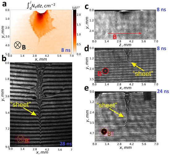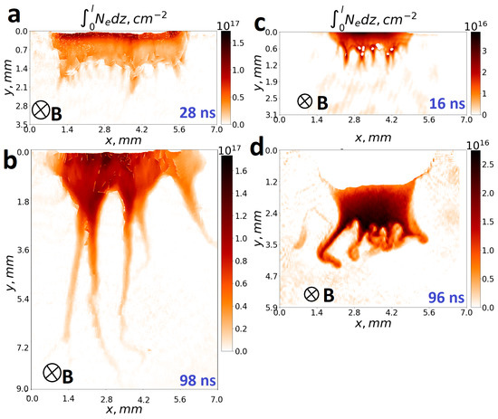 The plasma created by both nanosecond and femtosecond pulses is a conducting ionized gas. Therefore, the dynamics of such plasma in a strong magnetic field will differ significantly from Figure 2. The expansion of «nanosecond» plasma in a transverse magnetic field is described in detail in our previous works [6,14,55,64,65] and in other studies [4,66,67]. We will briefly outline the main stages of «nanosecond» flow dynamics, some of which are demonstrated in Figure 3a,b. At the initial stage, the ram pressure V2 of the plasma greatly exceeds the magnetic pressure, so it pushes apart and compresses the external magnetic field. At a certain point, the plasma pressure drops and equalizes with the magnetic pressure. At this stage, the so-called plasma diamagnetic cavity is formed [4,6,55] (Figure 3a) with the characteristic size described by the classical plasma stopping radius [4,66]. As a result of magnetic deceleration, the boundary of the cavity experiences an effective acceleration counterdirected to the density gradient. This leads to the development of the flute instability at the plasma front [4], which in some cases is referred to as magnetic Rayleigh–Taylor instability [6]. Further, the cavity starts to collapse and plasma is pressed-out of it, thus facilitating the development of Richtmyer–Meshkov-type instability [68]. At that stage, already in a quasi-hydrostatic regime, flutes develop and elongate, as shown in Figure 3b, while the cavity compresses into a thin plasma sheet moving across the magnetic field at an approximately constant velocity of 300–400 km/s. The detailed dynamics of such «nanosecond» cavity collapse is described in the works [6,64].
