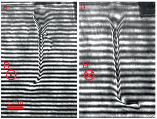 The detailed dynamics of «femtosecond» plasma in a transverse magnetic field, as far as the authors know, has not been studied before. As seen in Figure 3, the dynamics of «femtosecond» plasma significantly differ from that of «nanosecond» plasma. Firstly, there is no pronounced quasi-spherical cavity, as the one in the case of «nanosecond» plasma formed when the plasma pressure and the magnetic pressure were close. A likely explanation is that the femtosecond flow was initially collimated, so the radial components of the ram pressure tensor were minimal and unable to oppose magnetic forces, which redirected the plasma flow into a narrow «sheet» from the very early stages (the dynamics were studied from 0.5 ns). At the same time, no instability flutes were observed at the cavity boundary, which may also have the same cause, i.e., collimation of the flow. The magnitude of the projection of the effective acceleration at the lateral boundary separating the plasma and the magnetic field is small and cannot lead to Rayleigh–Taylor instability flutes. The plasma flow is first redirected into a narrow sheet, which, as in the case of «nanosecond» plasma, propagates with a quasi-constant velocity across the external magnetic field. More differences in the dynamics of the sheets (or «tongues») appear at ns (Figure 3e), when the bending at the tip of the «femtosecond» plasma «tongue» is observed. The direction of bending of the «femtosecond» plasma «tongue» depends on the magnetic field direction. By changing the direction of the external magnetic field in the experiment and observing the rotation of the plasma flow, it was found that the «femtosecond tongue» rotates toward the direction of ion motion in the external magnetic field (see Figure 4). Such an effect was not observed in the studies of «nanosecond» flows, where bending of the plasma «tongue» had a random direction.