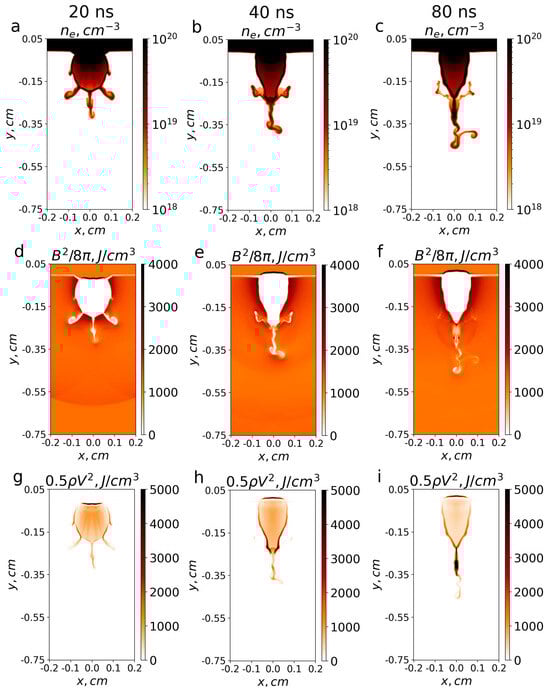 Simulations performed with three-dimensional MHD code FLASH. All images show slices at : (a–c) plasma density, (d–f) magnetic field pressure, and (g–i) dynamic plasma pressure 20, 40, and 80 ns after the start of irradiation.