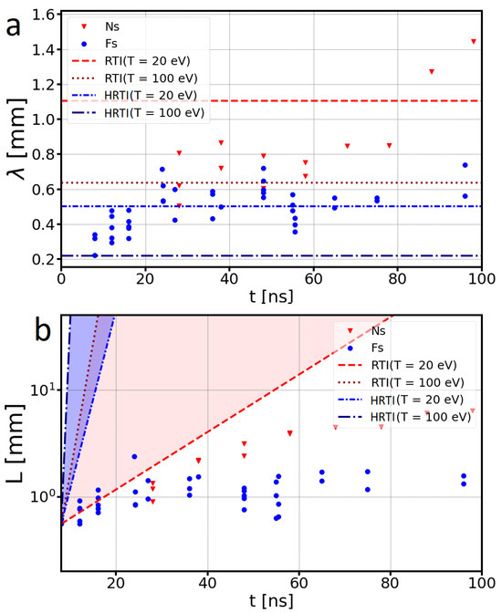 Comparison of experimental results with the linear theory of Rayleigh–Taylor instability (RTI) and Hall-modified Rayleigh–Taylor instability (HRTI). (a) Average wavelength of instability in experiments with elongated flows (Figure 5) for «nanosecond» (red triangles) and «femtosecond» (blue circles) plasmas. Horizontal lines indicate wavelengths obtained from the linear approximation of (RTI) and (HRTI) for temperatures of 20 and 100 eV. (b) «Tongue» lengths in experiments with elongated plasma flows (Figure 5) for nanosecond (red triangles) and femtosecond (blue dots) laser pumping. In the linear approximation, RTI (red lines) and HRTI (blue lines), the instability amplitudes () are plotted for two characteristic temperatures, T1 = 20 eV and T2 = 100 eV.