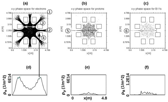 Figure 1. Snapshots of PIC-simulated diagnostic displays from simulating MET6 p+B11 fusion reactor operating in steady-state mode. Individual panels are as follows: (a) Dots indicating 2D positions of (macro)electrons originating from right-hand electron source, marked as ②. (b) Two-dimensional positions of protons originating from left-hand source, marked as ⑤. (c) Two-dimensional positions of B11 ions originating from left-hand source, marked as ⑥. (d) One-dimensional central section of electrons’ density. (e) One-dimensional central section of protons’ density. (f) One-dimensional central section of boron ions’ density plotted on 5X expanded ordinate scale.