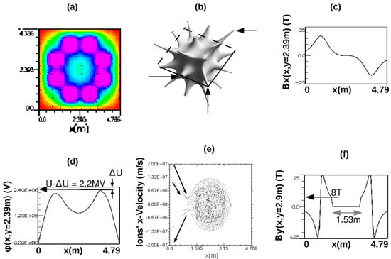 Figure 2. Diagnostic displays from simulating MET6 reactor operating in high-density mode. Individual panels are as follows: (a) Two-dimensional map (online magenta = 2.4 MV) of electrostatic potential. (b) Three-dimensional rendering of magnetic field iso-surface [18]. (c) One-dimensional section of x-component of applied B-field. (d) One-dimensional central potential extracted from 2D potential shown above it. (e) Two-dimensional map of protons’ (gray) and borons’ (black) locations in velocity–position phase space (f) Vertical (y) component of magnetic field including diamagnetic cancelation of central field.