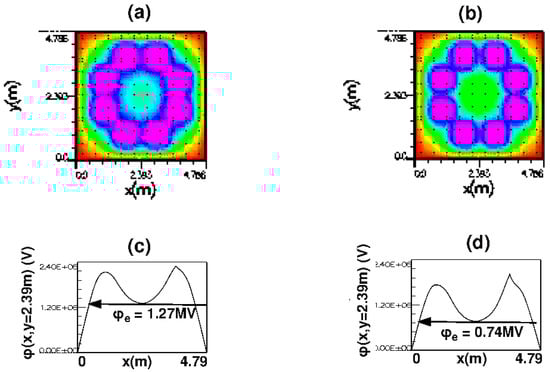 The design still holds promise as a contender for commercial power because the predicted quality factor depends on the reactor’s many design parameters, most of which have not been systematically explored. For example, the best footprint for the HTS magnets is unknown, pending future development by HTS magnet designers, e.g., Commonwealth Fusion Systems of Massachusetts. In lieu of a specification for a workable HTS magnet, we chose to adopt the footprint of a commercially available resistive magnet [7]. The simulated footprint of the magnet affects the design’s performance in a complex way. The surfaces of the four magnets mounted on the four side-faces of the cube intersect the simulation plane in the eight square boxes shown in each panel of Figure 1a–c. The bias voltage applied to the magnets creates a complicated equipotential surface determining the E-field throughout the simulated plane. The shape of a resistive magnet is normally optimized to facilitate water-cooling through hollow wires wound on a cylindrical central spool. HTS magnets would be optimized differently, producing a different E-field from the resistive design. The design of our HTS magnets would include features chosen to maximize the quality factor via computer simulation.