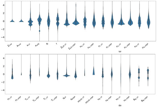 Violin plots (a) and (b) showing the standardized distribution of the dataset. The horizontal axis represents different quantities, while the vertical axis indicates their range. The subscripts ‘ctr’ and ‘edge’ denote distributions at the center and edge of the DIII-D plasma, respectively.