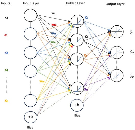where p is the number of samples, is the target value, and is the predicted value. Since the predicted values depend on the network’s weights, the loss function is also a function of these weights. The MSE loss function (5) is particularly suitable for regression problems where the neural network predicts a continuous scalar value.