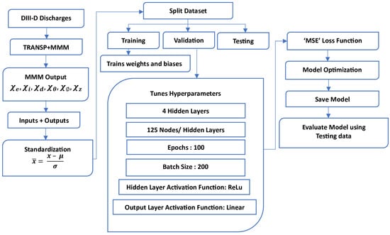The workflow for training MMMnet is illustrated in Figure 4. This process begins with acquiring data from TRANSP simulations of DIII-D discharges, which provide the inputs and outputs for the neural network. The data undergoes standardization to ensure consistent scaling before being split into three subsets: training, validation, and testing. The training set is used to optimize the model’s weights and biases, while the validation set is utilized for hyperparameter tuning and overfitting prevention. The testing dataset serves to evaluate the model’s generalization to unseen data.
